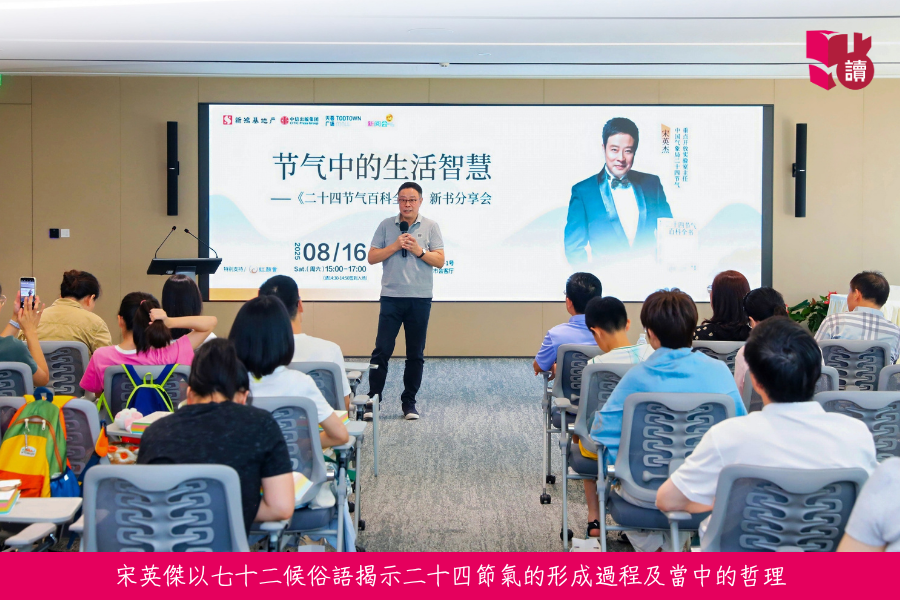 閱讀無界限,任何地方都可成為新閱會分享好書的舞台!承接七月份的「新地齊讀好書」活動,新閱會繼續在上海延續這份喜「閱」。作為新閱會閱讀分享活動的重要一站,新鴻基地產旗下上海 TODTOWN Mall 天薈廣場與中信出版攜手,於 8 月中特邀中國氣象局二十四節氣重點實驗室、中國氣象局氣象服務首席專家宋英傑,帶來其新書《二十四節氣百科全書》在 TODTOWN 天薈城市會客廳舉辦私享城市會。